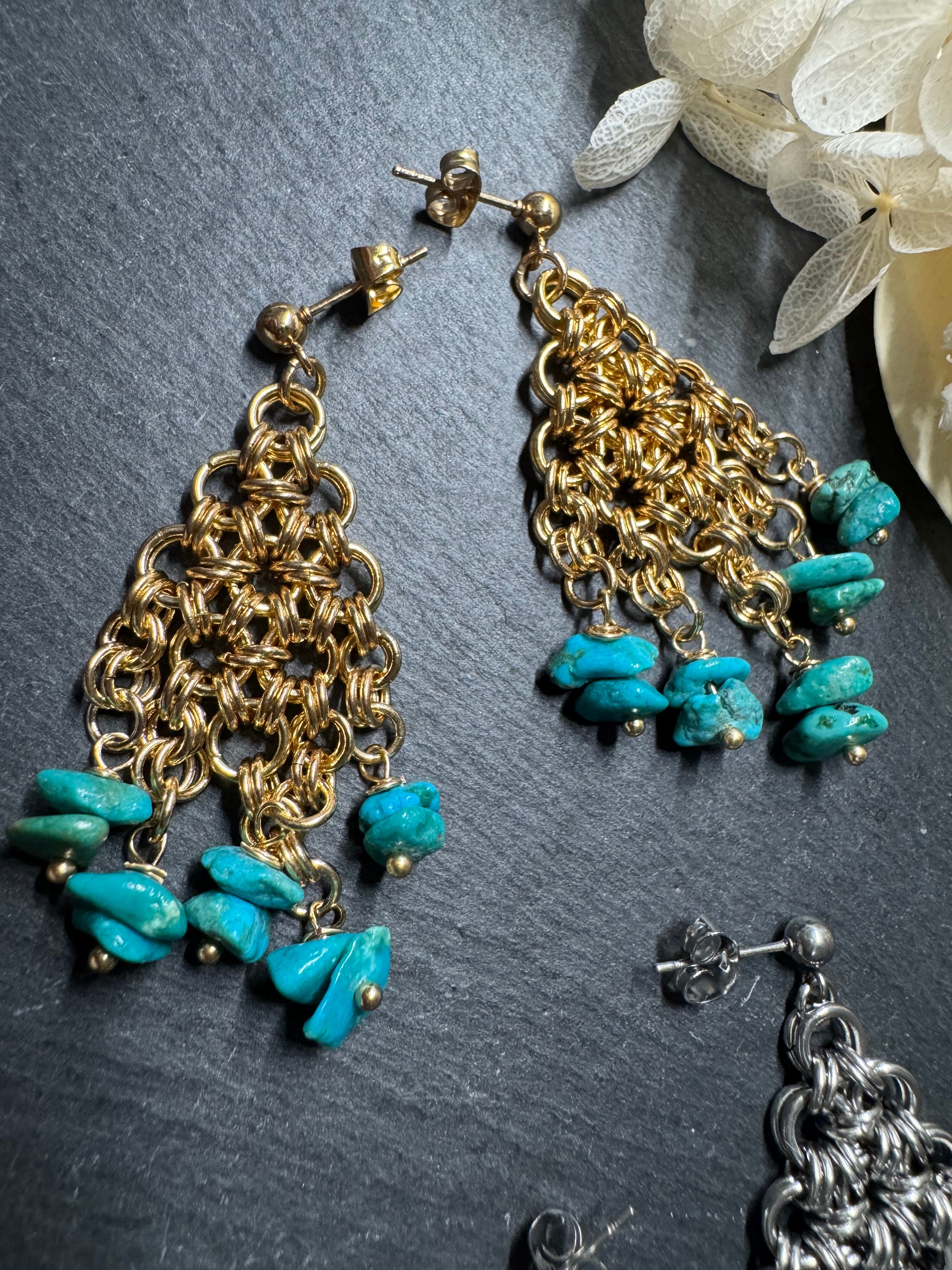 丸カンのみを繋いだチェインメイルに天然ターコイズをあしらった、夏らしいイヤアクセサリーです。 ピアス ステンレス製 イヤリング 合金