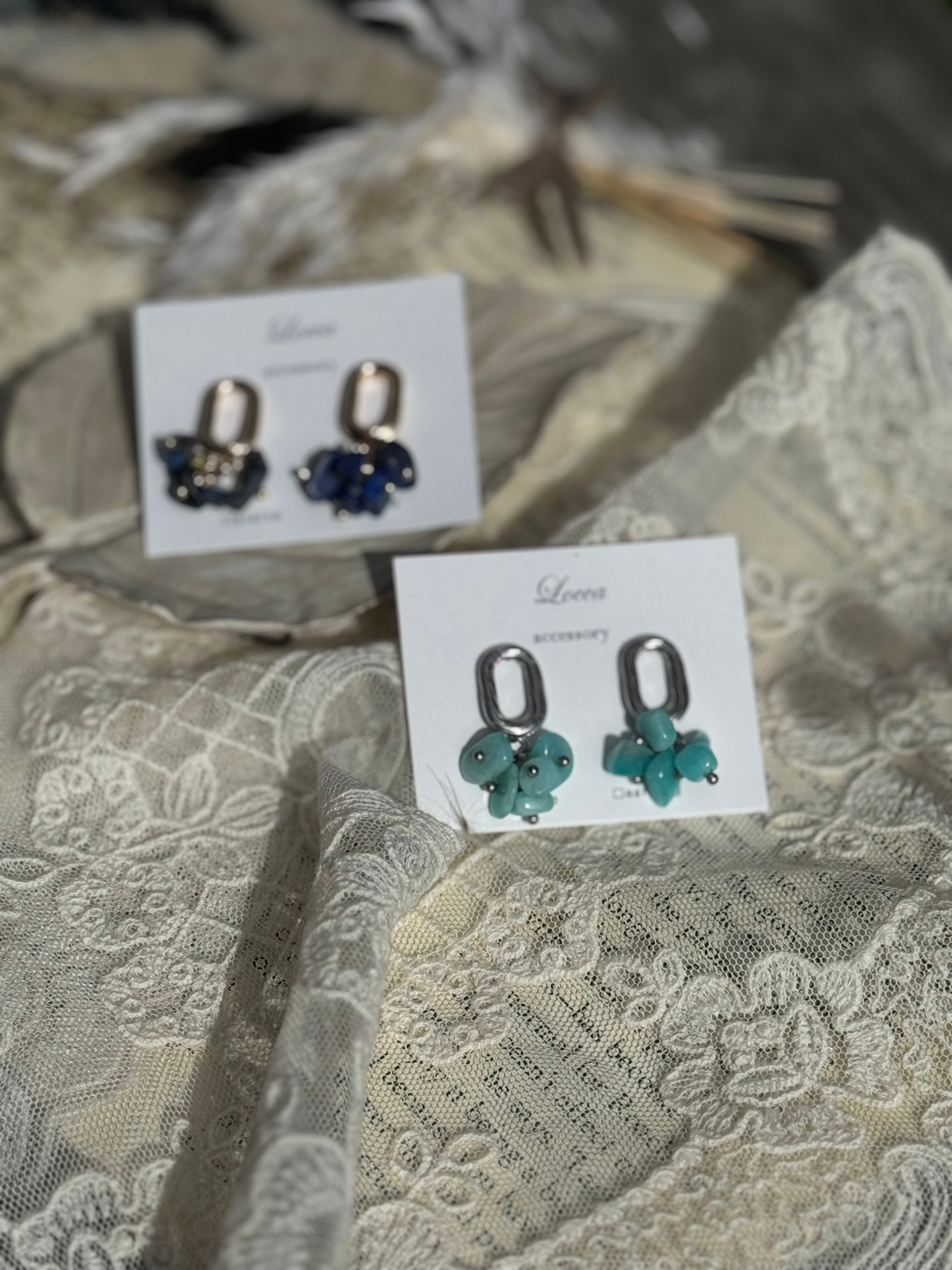 天然石の小ぶりなピアスorイヤリングです。 ゴールドには、ラピスラズリ シルバーには、アマゾナイト があしらわれてます。