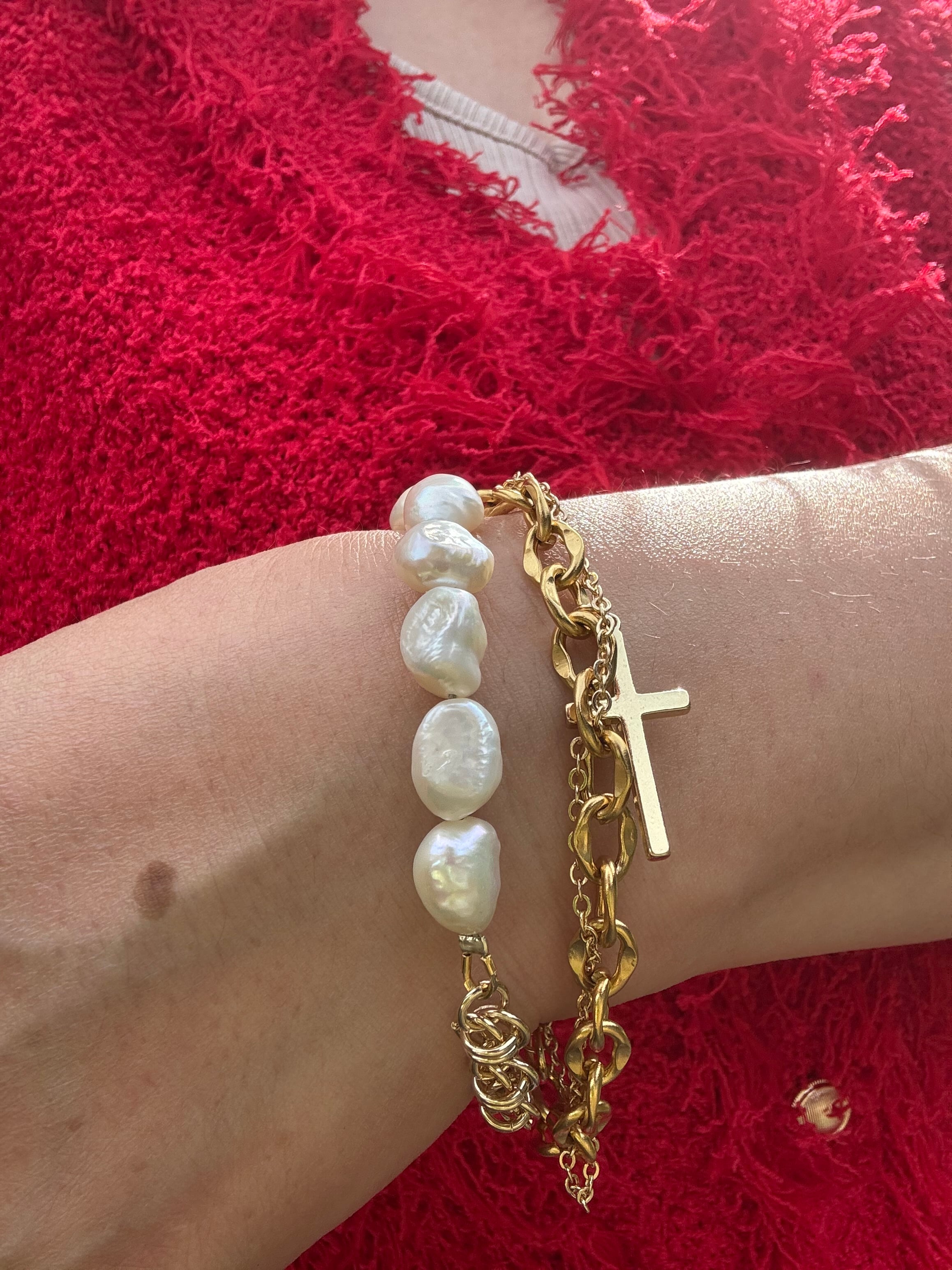 パールのブレスレットと、クロスチャームが付いたブレスレットの2本組です。