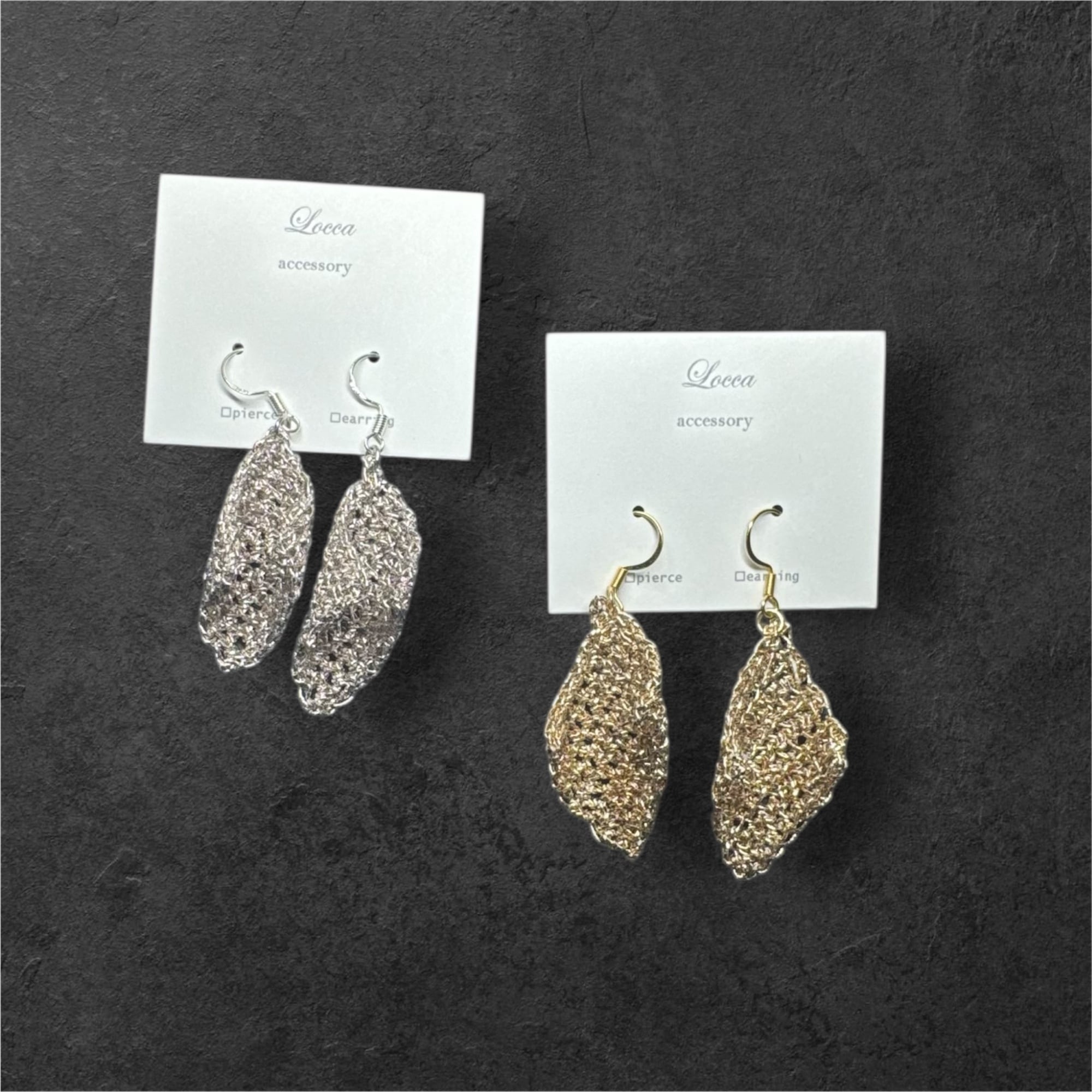 金属に見える糸で変形スクエアのピアスorイヤリングを編みました。