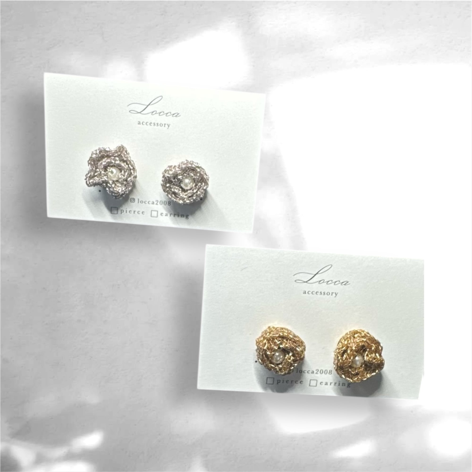金属に見える糸で、ローズ形の小ぶりピアスを作りました。